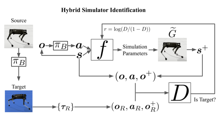 As learning-based approaches progress towards automating robot controllers design, transferring learned policies to new domains with different dynamics (e.g. sim-to-real transfer) still demands manual effort. This paper introduces SimGAN, a framework to tackle domain adaptation by identifying a hybrid physics simulator to match the simulated trajectories to the ones from the target domain, using a learned discriminative loss to address the limitations associated with manual loss design. Our hybrid simulator combines neural networks and traditional physics simulaton to balance expressiveness and generalizability, and alleviates the need for a carefully selected parameter set in System ID. Once the hybrid simulator is identified via adversarial reinforcement learning, it can be used to refine policies for the target domain, without the need to collect more data. We show that our approach outperforms multiple strong baselines on six robotic locomotion tasks for domain adaptation.